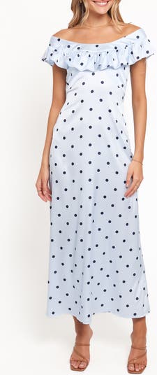Celebratory dots add a party-perfect vibe to this figure-skimming maxi made in a shoulder-showing silhouette and trimmed with a fluttering frilled neckline.