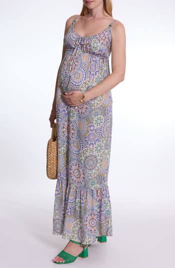 The Mandala maternity maxi dress is pure summer joy. With its boho print, pearl-accented straps, and discreet zip for nursing, it’s the ultimate statement piece with function and flair.