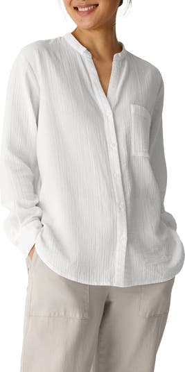 Two airy layers of organic cotton lend subtle texture and sumptuous movement to this easy-fitting button-up shirt topped with a timeless mandarin collar.