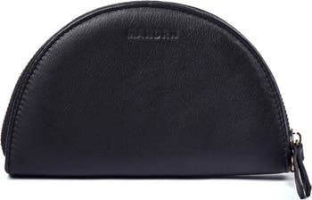 A premium half moon leather wallet with a card slot, cash compartment, lipstick holder, and a zip coin pouch.