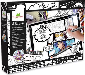 Sycomore Manga – XXL+ LED Light Pad and Markers Workshop – Ages 10+ Ignite your imagination and dive into the world of manga with the XXL+ LED Light Pad and Markers Workshop, a complete creative kit designed for young artists aged 10 and up. This extra-large light pad provides a bright, evenly lit workspace that makes tracing, sketching, and character designing effortless and fun. Paired with a high-quality layout paper pad and vibrant color markers, this set gives artists everything they need to develop their own manga characters, scenes, and stories. The spacious surface allows for comfortable drawing, while the lightweight design makes it perfect for use at home, in the classroom, or on the go. Whether you're a beginner learning the basics or a growing artist refining your technique, this workshop set offers an engaging and inspiring manga-drawing experience. Specifications: Color: Multicolor Recommended Age: 10 years and older Size (inches): 14.17 x 1.97 x 10.24 Material: Layout paper pad and color markers Weight (lbs): 2.71 Care Instructions: Keep markers capped when not in use to preserve color quality. Clean the LED light pad with a soft, dry cloth; avoid liquids or abrasive cleaners. Store the kit in a cool, dry place to maintain durability.