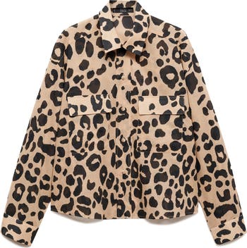 Serve up bold energy in this animal-print button-up shirt designed with handy patch pockets and cut in a layerable silhouette.
