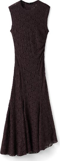Lovely floral lace romances this figure-skimming maxi that's fitted at the waist and finished with a drapey flared hem.