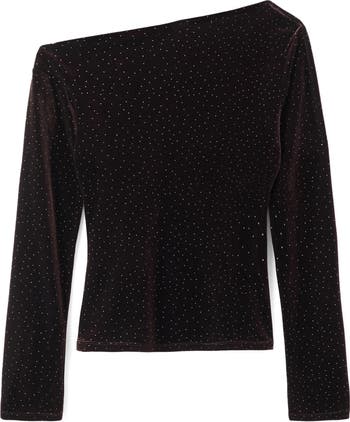 Allover rhinestones punctuate this dazzling velvet top with an asymmetric neckline that lets you show off the perfect touch of skin.