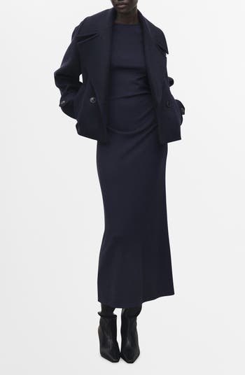 Barely there cap sleeves elegantly frame this fine-knit midi dress shaped by ruching at the sides for a curve-hugging fit.
