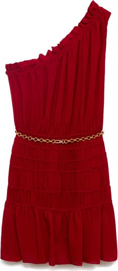 A chain-link belt adds an extra flash of glamour to this shirred minidress fashioned with an asymmetric neckline.