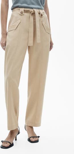A drapey belt and angled flap pockets offer utilitarian allure to pants crafted from linen-enriched fabric for breezy comfort.