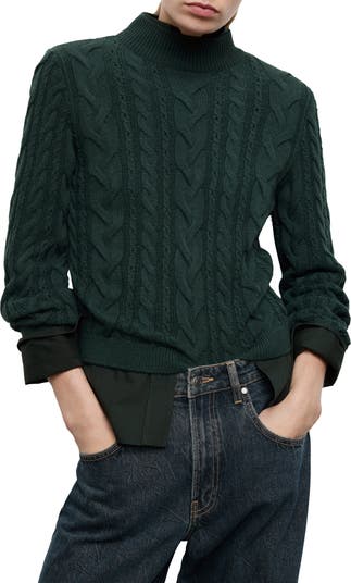 Braided cables add warmth to this cozy-day sweater knit with a sophisticated mock neck and anchored by ribbed trim.