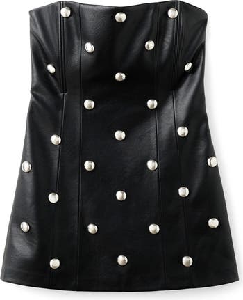 Silvery studs and glossy faux leather bring biker-chic to the party dress game.