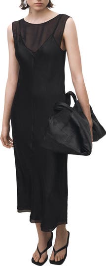Designed with a semisheer yoke, this figure-skimming maxi is rendered in matte satin and finished with a drapey layered hem.