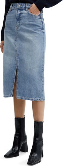 A front slit lets you stride smoothly through your day in this nonstretch-denim skirt cut to an on-trend midi length.