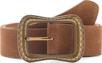 Intricate engraving on the brassy buckle lends Western vibes to this essential belt.