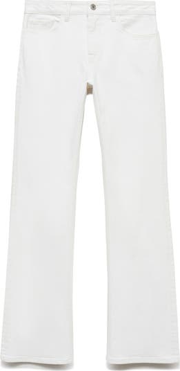 Made from low-stretch denim, these bright-white jeans feature a mid-rise waist and floor-sweeping flared legs to add drama to everyday outfits.