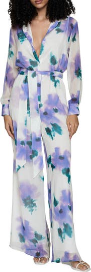 Watercolor-inspired blooms artfully decorate this lightweight, textured jumpsuit popped with a polished collar and tethered at the waist by a matching sash.