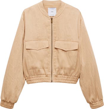 Flowy fabric with a subtle crinkle effect lends a contemporary look to this lightweight bomber jacket.