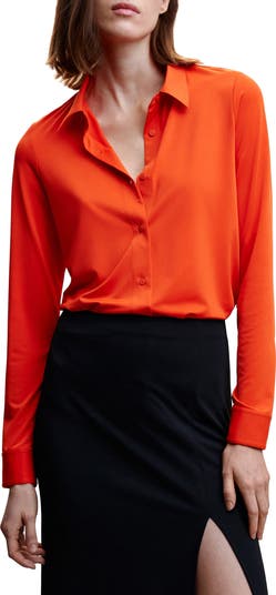 A vibrant hue emboldens this long-sleeve button-up crafted from flowy fabric enhanced with stretch for daylong comfort.