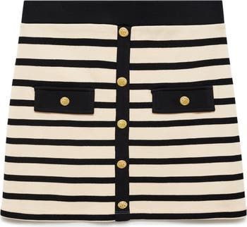 Decorative goldtone buttons put a sophisticated spin on a knit cotton miniskirt complete with dual flap pockets.
