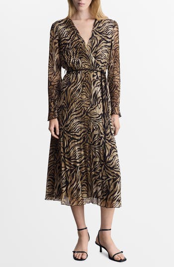 Slim accordion pleats and a lively leopard pattern bring stunning dimension to a long-sleeve midi dress fashioned with an optional waist tie for versatile styling.