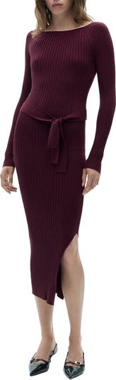 Made from rib-knit fabric for a figure-skimming fit, this fluid midi dress showcases an elegant wide neckline and a side-slit hem.