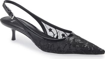 Patent trim and sparkling sequins ensure you shine in this pointy-toe mesh pump set on a walkable kitten heel.