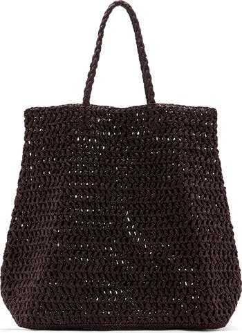 Finely woven paper straw shapes a resort-ready tote designed with a slouchy profile and roomy interior perfect for quickly storing your on-the-go necessities.