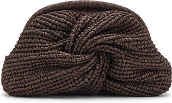 A voluminous front knot highlights the finely woven exterior of a geometric frame clutch featuring an optional chain strap for hands-free convenience.