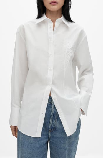 The tailored lines and signature details of the classic white button-up are give dramatic proportions in this rendition cut from smooth poplin that blends cotton with lyocell that gives the crisp fabric a fine drape.