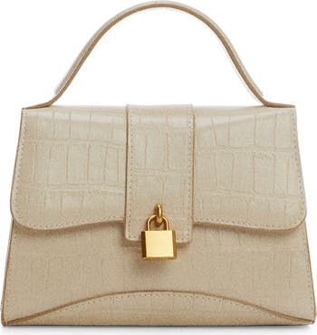 A polished padlock gleams at the front flap of a croc-embossed bag fitted with a single top handle and optional chain strap for versatile wear.