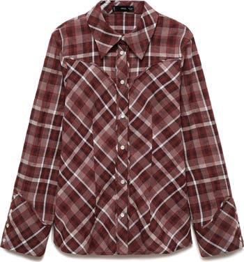 Lumberjack plaid emphasizes the Western-inspired influences of this cotton-blend shirt boasting snap cuffs that can be left undone for a fluted look.
