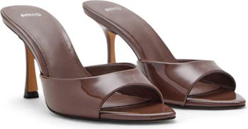 A pointy toe furthers the streamlined profile of a minimalist slide sandal featuring a faux-leather upper and lifted by a stiletto heel.
