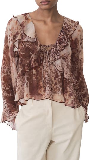 Floaty ruffles bring romance and fluttering movement to this printed top made with a dainty neck tie and framed by flared sleeves.