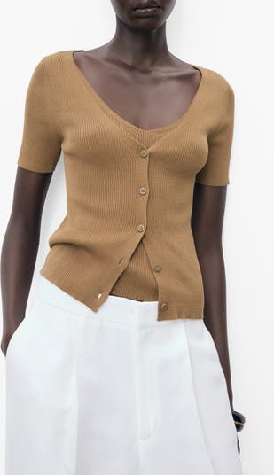 Allover ribbing shapes this close-fitting cardigan knit with short sleeves and perfect for looks from work to play.