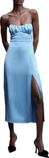 Bring a dreamy vibe to your evening look with this satin slipdress featuring a ruched bodice and thigh-baring slide slit.