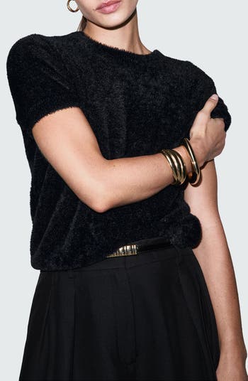 Cozy comfort meets party-ready style with this short-sleeve sweater made from plush faux fur that adds soft texture to your look.