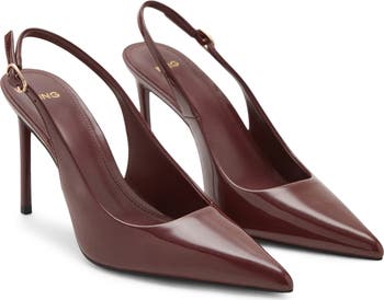 A pointy toe and svelte stiletto heel bring fierce balance to a glossy pump featuring an adjustable slingback strap for a secure fit.