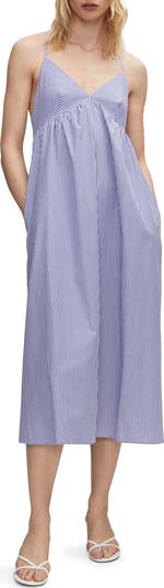 Crisp vertical stripes decorate this airy cotton midi dress popped with handy pockets and hung from slender cross-back straps.