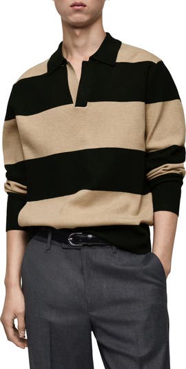 Bold stripes traverse a johnny-collar sweater knit from fine-gauge yarns in a comfortably relaxed fit.