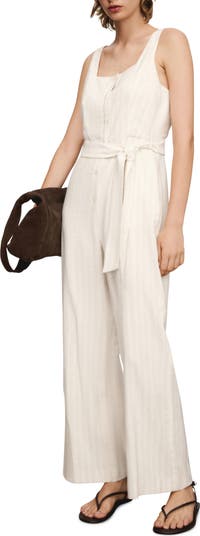 Style is effortless in this button-front jumpsuit characterized by handy side pockets and a matching tie belt.