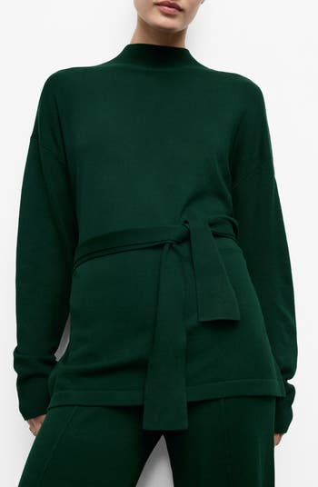 A tie at the waist lets you adjust the silhouette of this finely knit sweater featuring a mock neck and a longer length.