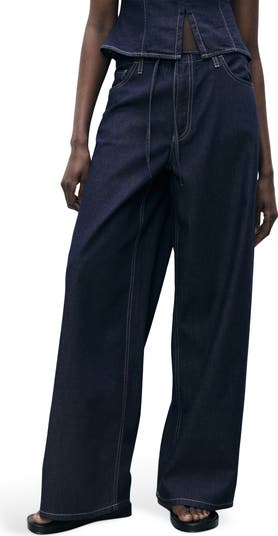 Pronounced topstitching outlines these dark-wash jeans made with wide hems for a leg-elongating silhouette.