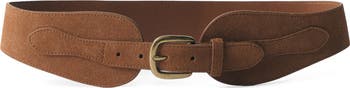 A curvy corset-inspired belt crafted from supple suede is highlighted with a petite goldtone buckle to bring subtle glint.