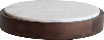 Mango Wood and Marble Food Pedestal with Removable Marble Tray, Walnut Finish, White
