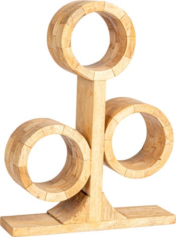 This Mango Wood Circular Wine Rack is a testament to skilled craftsmanship and elegant design. The rack's natural mango wood color radiates warmth, while its unique circular shape provides a secure and stylish home for up to three bottles of wine. The inner holes, measuring 4.25 inches in diameter, ensure that each bottle is cradled perfectly. With dimensions of 11.50 inches in length, 3.75 inches in width, and 15.25 inches in height, it's an ideal size for a countertop or bar area, inviting admiration and conversation. Whether for personal use or as a gift, this wine rack is a delightful blend of beauty and practicality.