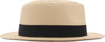 A grosgrain ribbon is elegantly wrapped around the crown of this lightweight straw fedora.