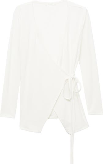 A slender tie secures the wrap design of this ribbed cardigan that gives any look you create with it a graceful finish.