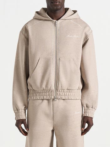 This elevated everyday piece combines comfort with considered design. Cut in a relaxed fit from heavyweight cotton, it features contrasting whipstitch along the seams for subtle structure. A two-way zip offers styling versatility, while ribbed hem and cuffs add a clean, functional finish. The relaxed design provides comfort and ease throughout daily wear without compromising style.