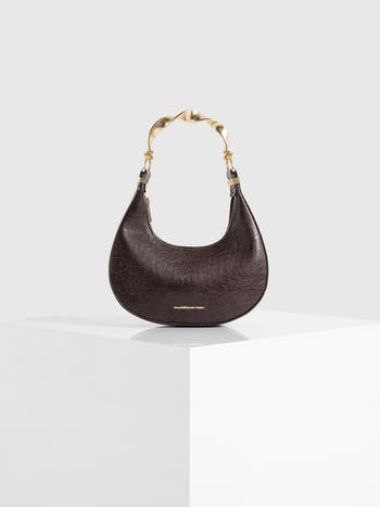 A structured silhouette defines this bag, balancing practicality with modern design. Crafted from vegan leather, it offers a smooth, refined finish that enhances its contemporary appeal. The twisted handle adds a distinctive design element, while gold hardware accents complete the look with a considered, elevated touch.