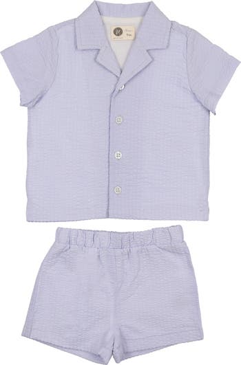 Perfectly rumpled cotton seersucker invites breezy, sunny-day comfort in a camp shirt and matching shorts sized for kids who like to look dapper when the weather is warm. They work well as a set and mix/match easily with other casual favorites for expanding your child's wardrobe without blowing up your budget.