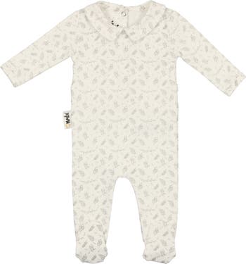 A print of leaves and branches brings subtle charm to a stretchy cotton footie accented with a neat collar.