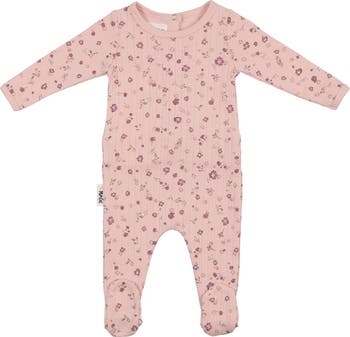 A floral print sweetens this pointelle-knit footie made from cotton-rich fabric for baby's comfort.